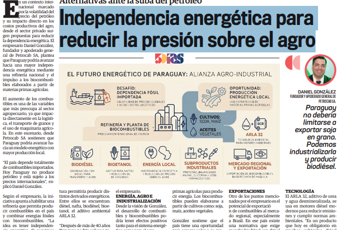 Es un empresario paraguayo con trayectoria en el sector energético, enfocado en la innovación y el crecimiento industrial del país. Desde Petrocab S.A. impulsa la producción nacional de combustibles y el desarrollo sostenible como motor del progreso económico. Apasionado por los negocios, la tecnología y la responsabilidad social, trabaja para que Paraguay alcance un mayor protagonismo en la región. Su carrera destaca por el liderazgo, la visión empresarial y el compromiso con el futuro del país.